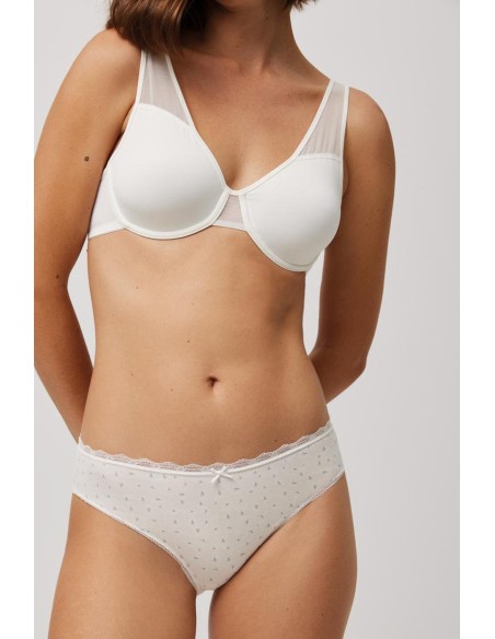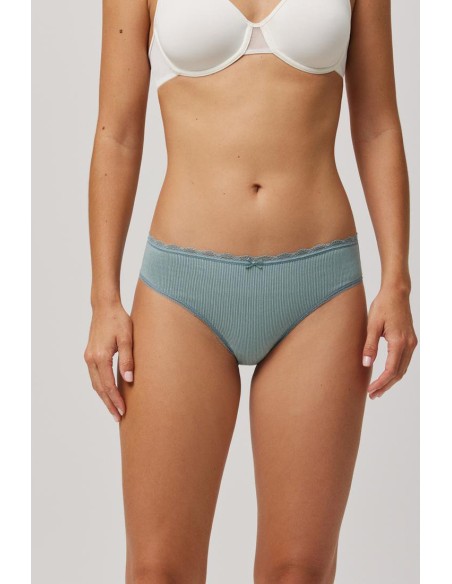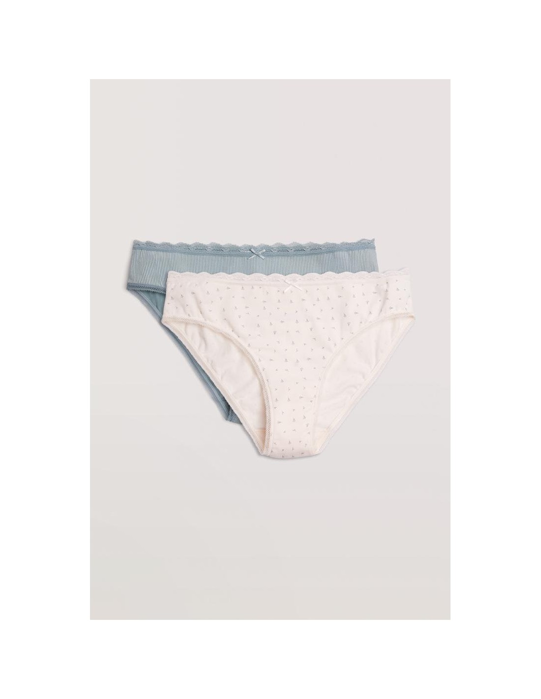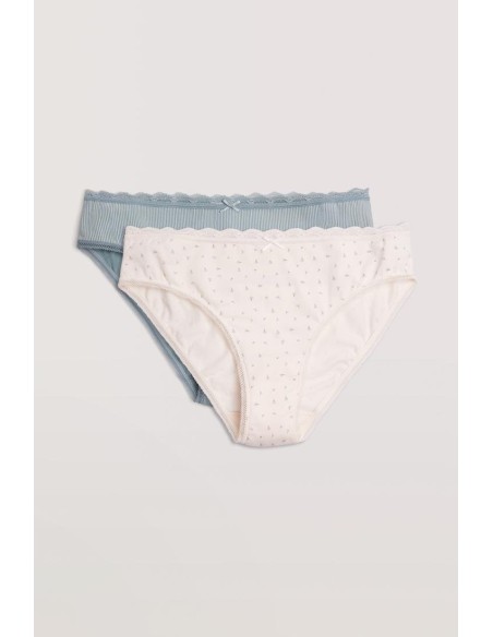 Pack de 2 braguitas midi básicas estampadas de algodón con detalles de encaje en la zona de la cinturilla y piernas. Presenta rizo en el interior para mayor comodidad.