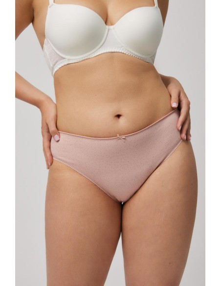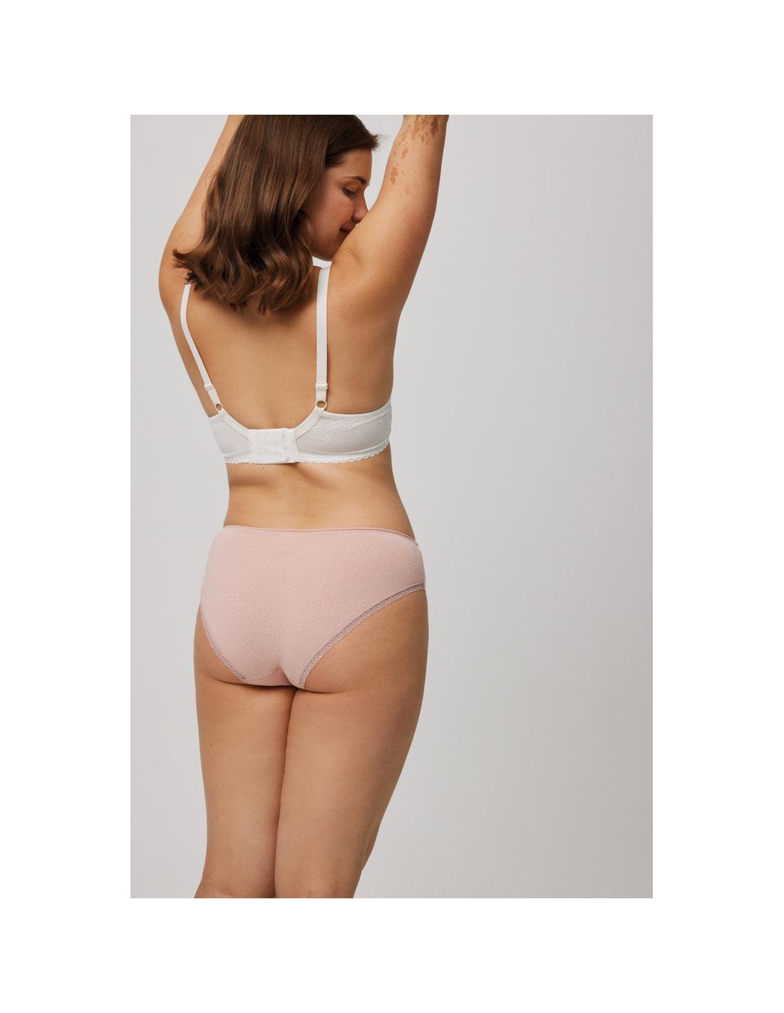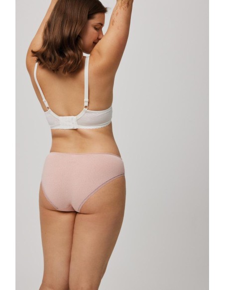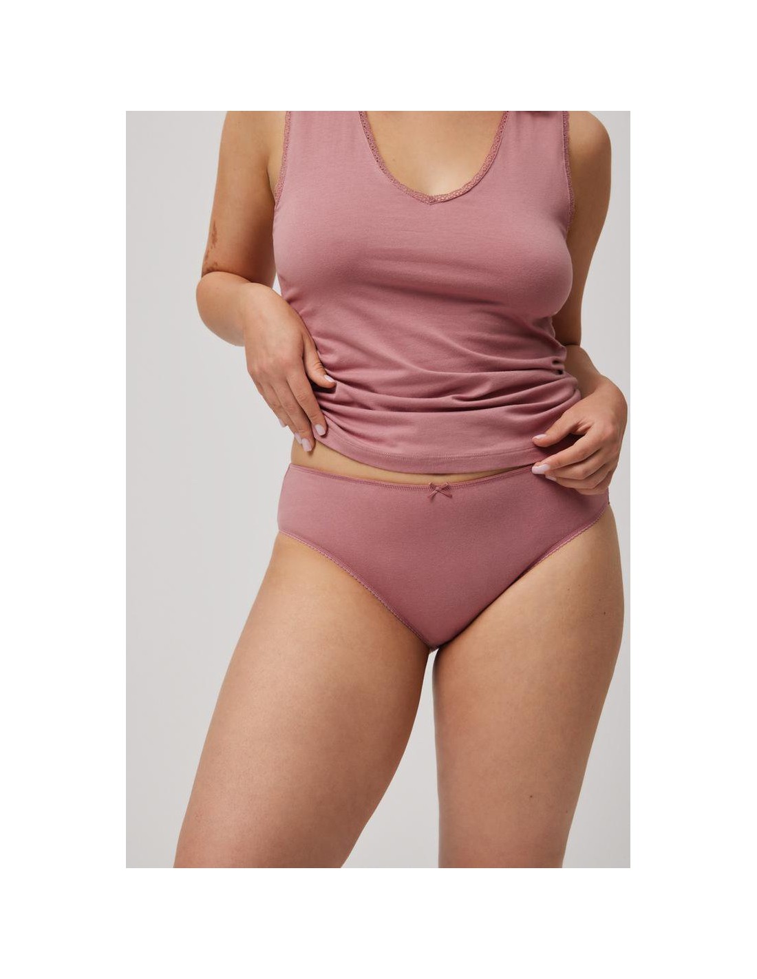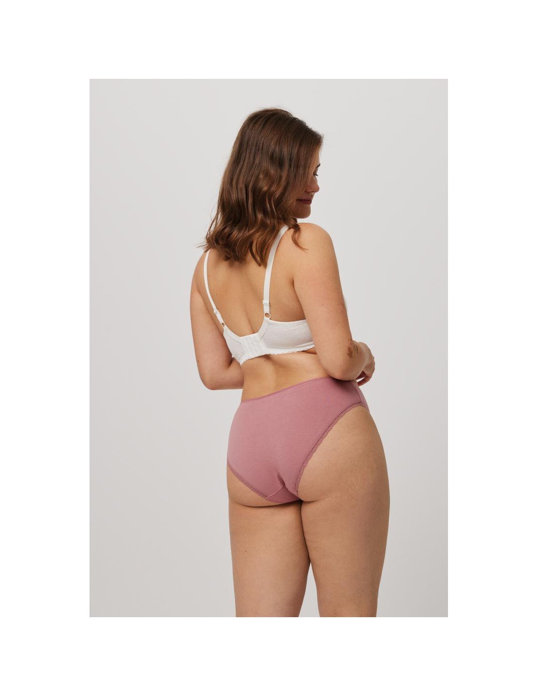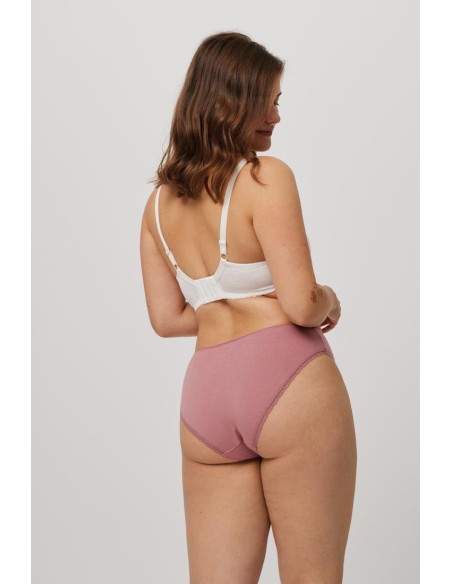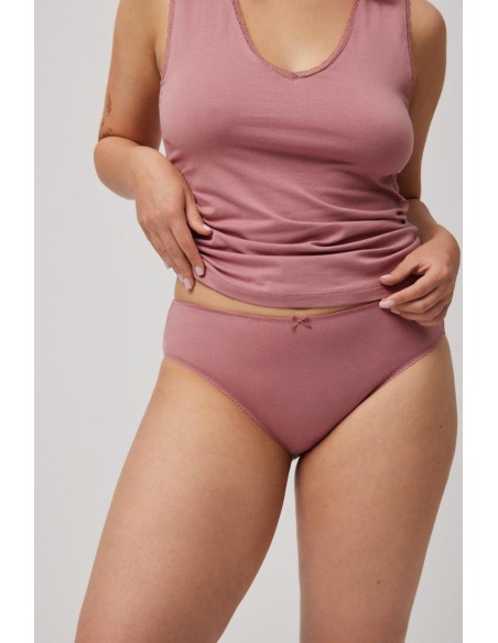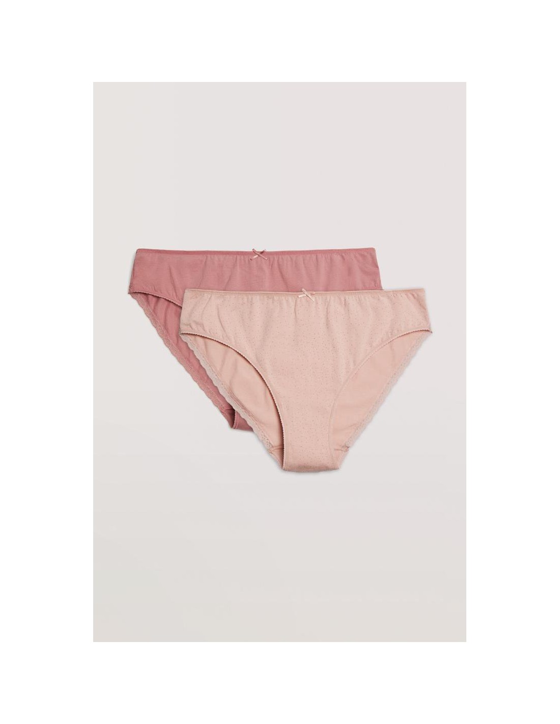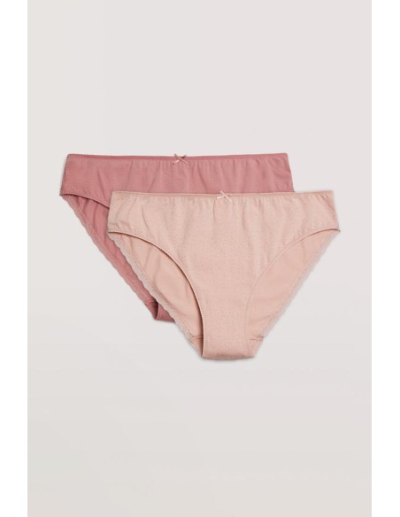 Pack de 2 bragas midis con ribete decorativo que bordea la zona de la pierna. Confeccionado en tejido suave y cómodo de algodón. Una de las variantes es estampada y la otra es en color rosa quemado. Presenta rizo en el interior para mayor comodidad.