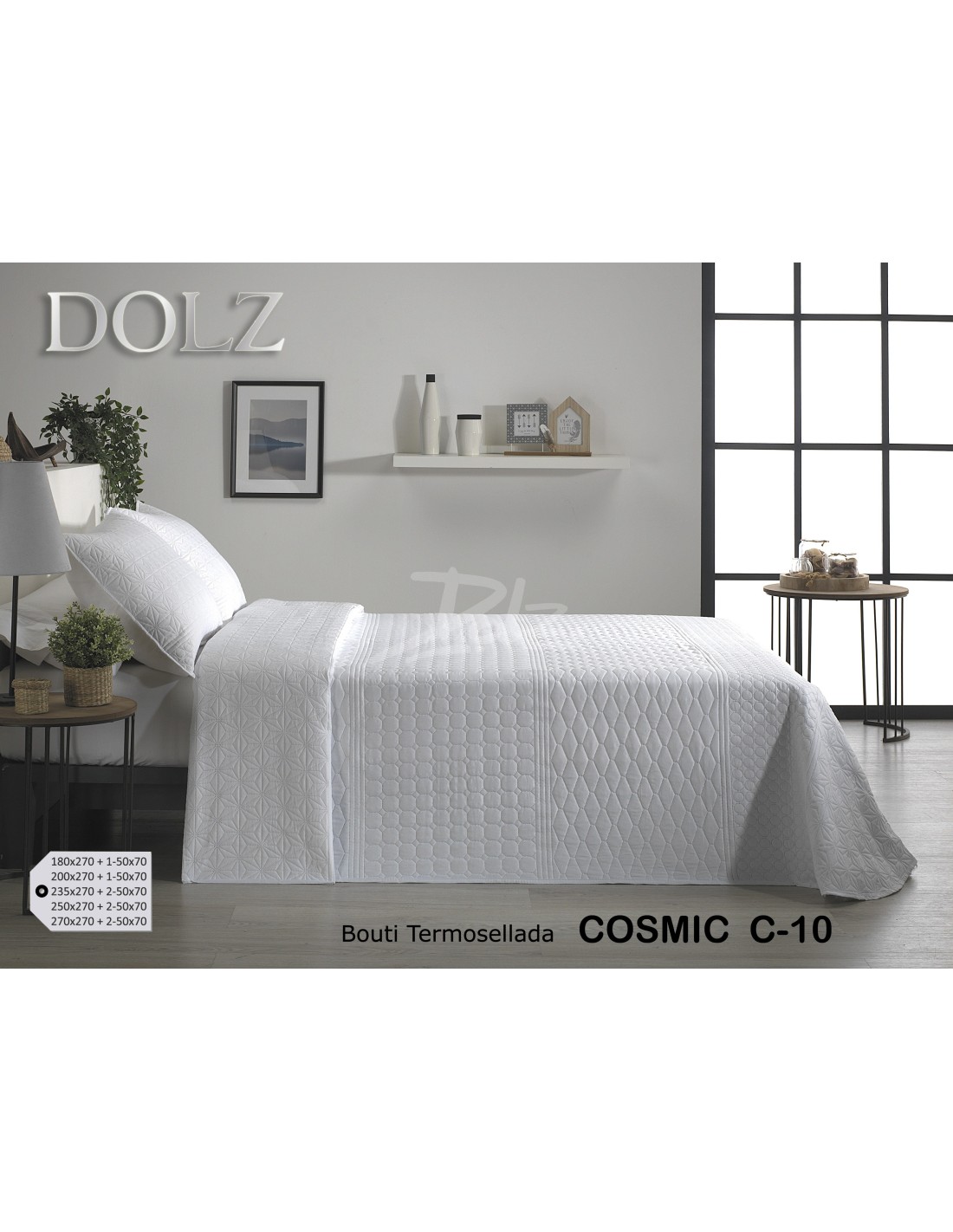 Colcha bouti termosellada, de acolchado fino, con un diseño de relieve de distintas formas sobre fondo blanco.