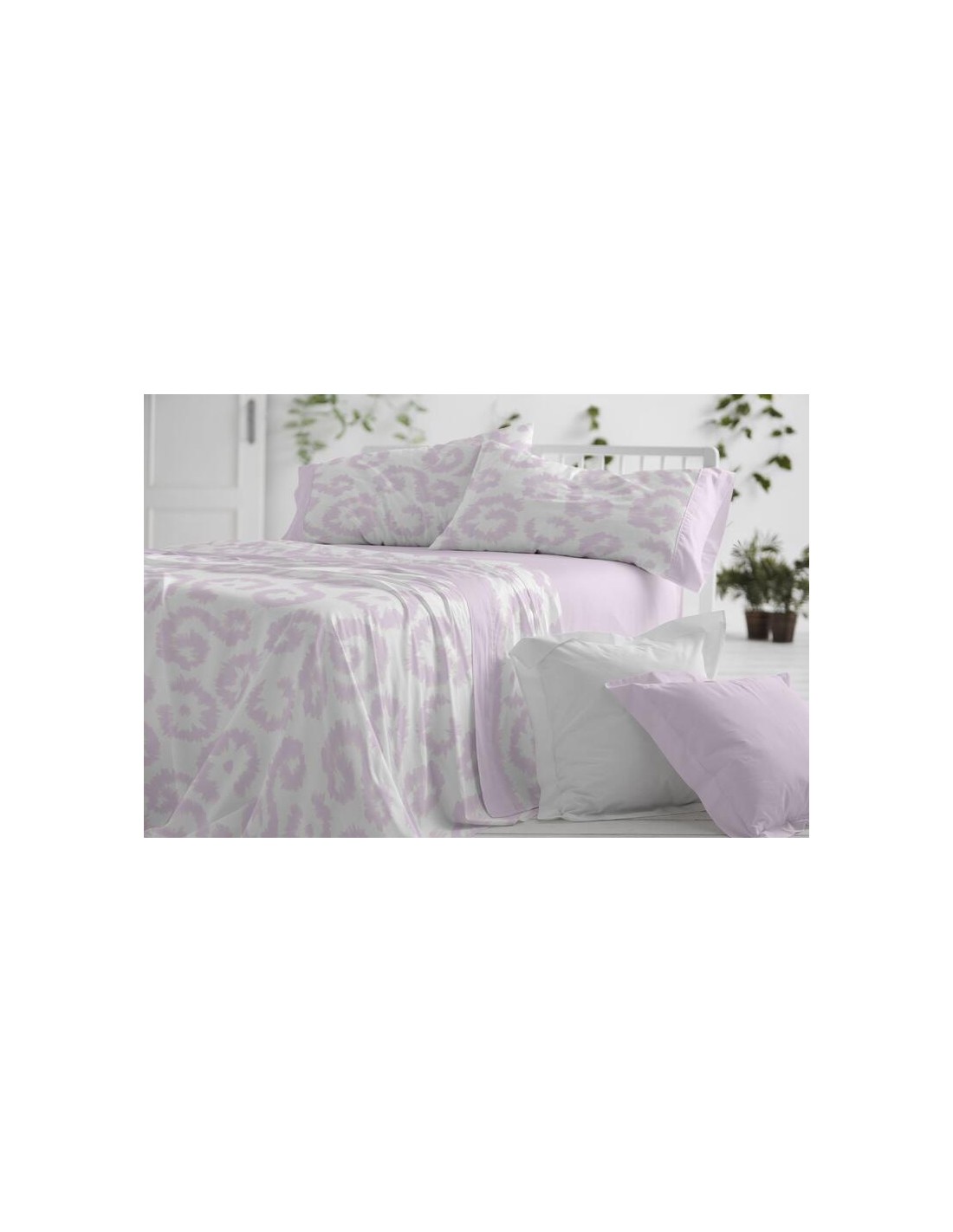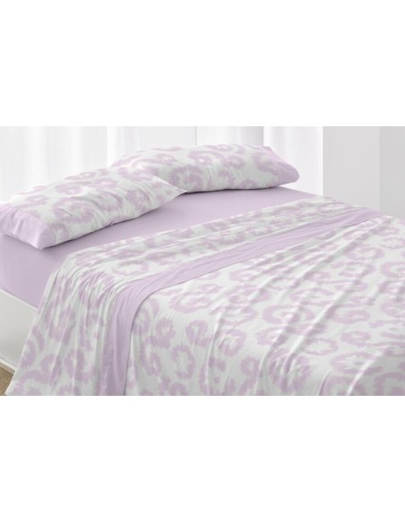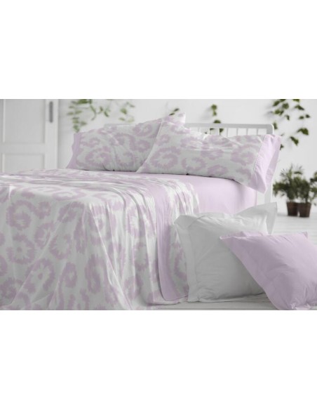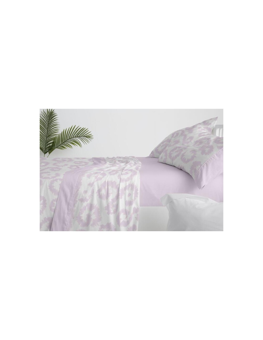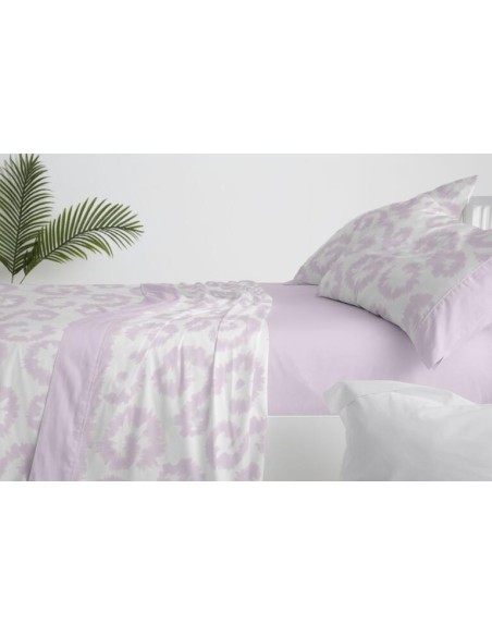 Sábanas juveniles en un diseño estampado de estilo étnico en un tono de verde laurel y blanco. La sábana bajera y las aplicaciones que enmarcan la funda de la almohada, se muestran mediante un falso liso conseguido mediante tramas del mismo verde oliva. Una sábana moderna para conseguir un look juvenil en el dormitorio.