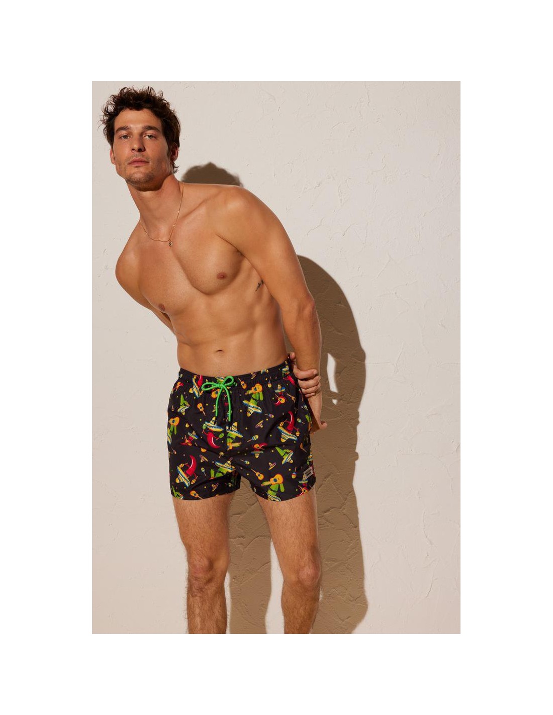 Sockarrats Swim Collection. Bañador de corte medio y secado rápido con un divertido estampado de viñetas cómic. Tejido Ligero. Cordón en cintura con el que ajustar la prenda a la silueta. Suspensor interior en suave malla para un confort total. Bolsillos laterales y traseros con evacuadores de agua.