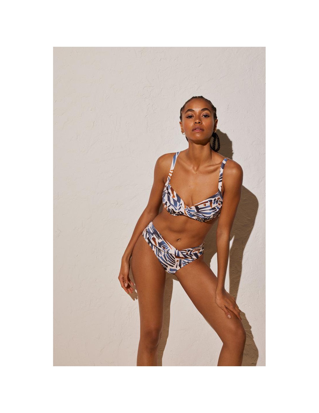 Bikini con aro reductor copa D con relleno. El top con aro permite una perfecta sujección del pecho. Incluye tirantes fijos y regulables para una mayor sujeción. Incorpora un cierre de broche para mayor comodidad y naturalidad. Contiene braguita midi.