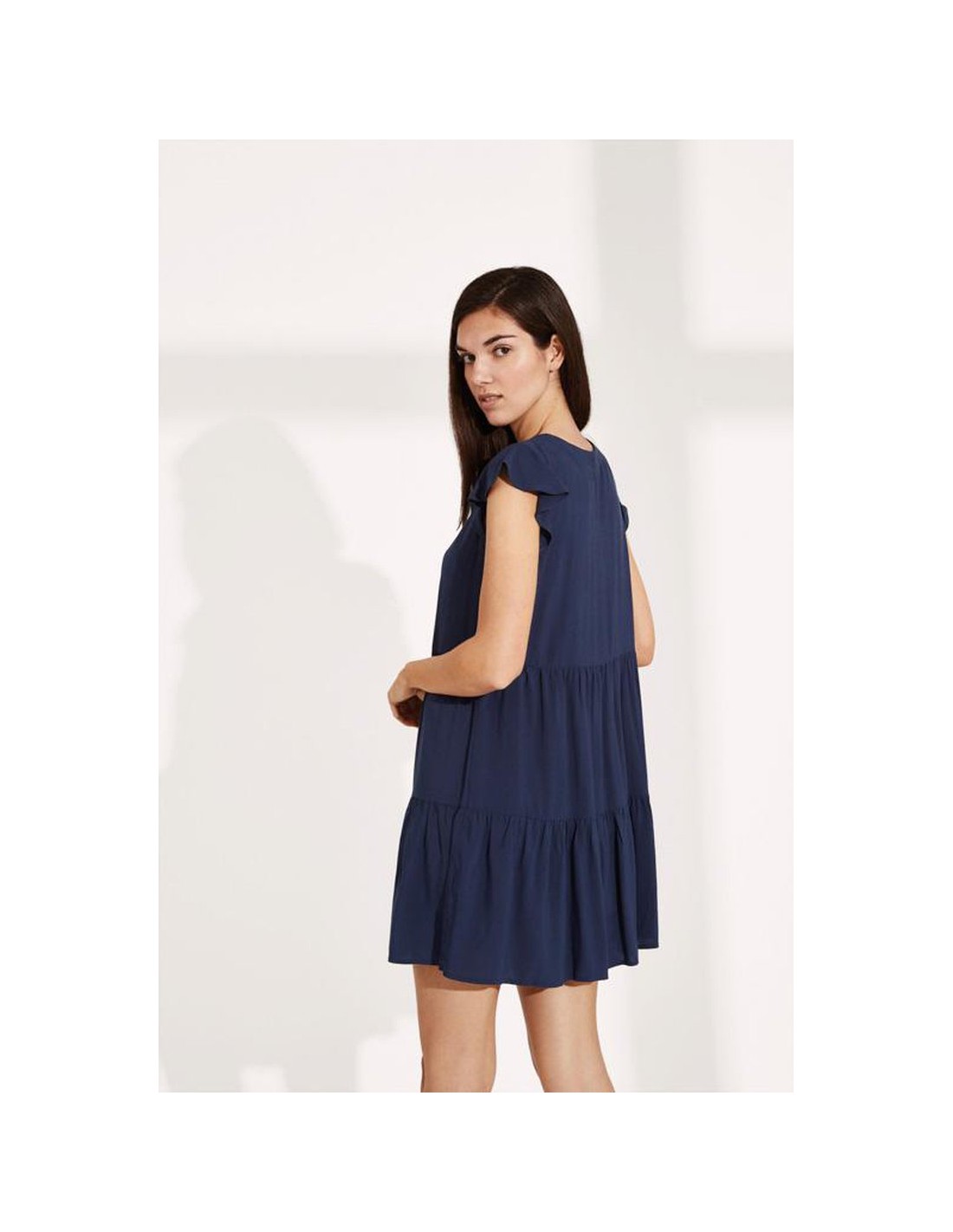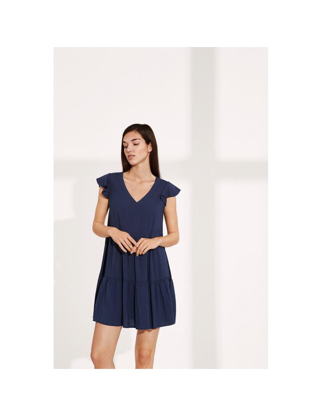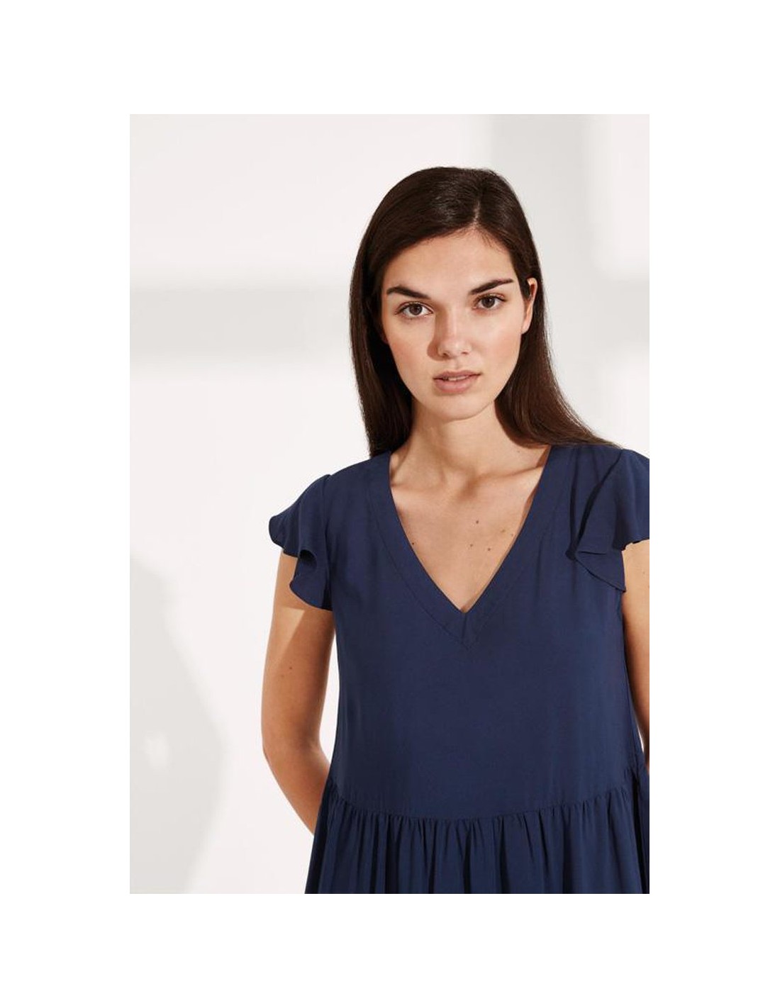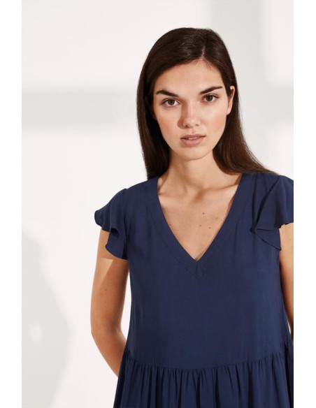 Color block en este vestido de estilo ligero y fluido. Las mangas tipo volante, totalmente ideales. La falda, estructurada, da movimiento a la prenda. Perfecta para los días y las noches de verano.