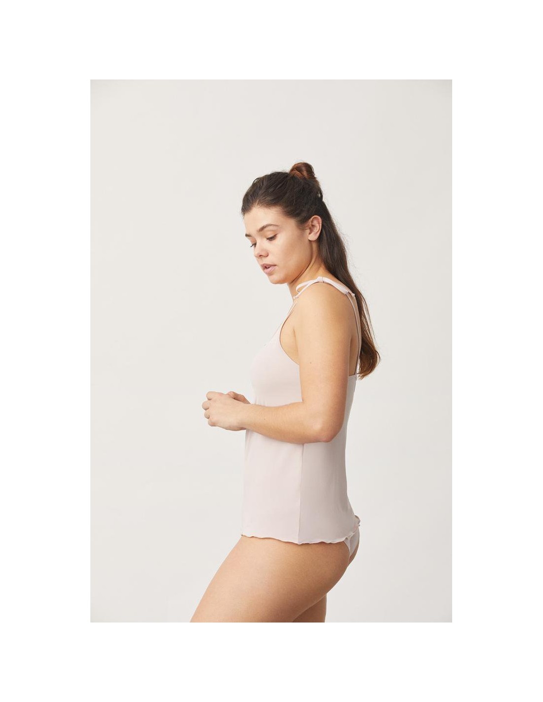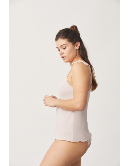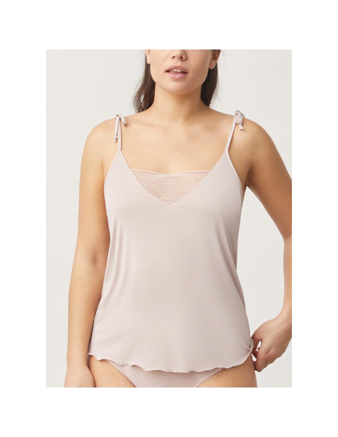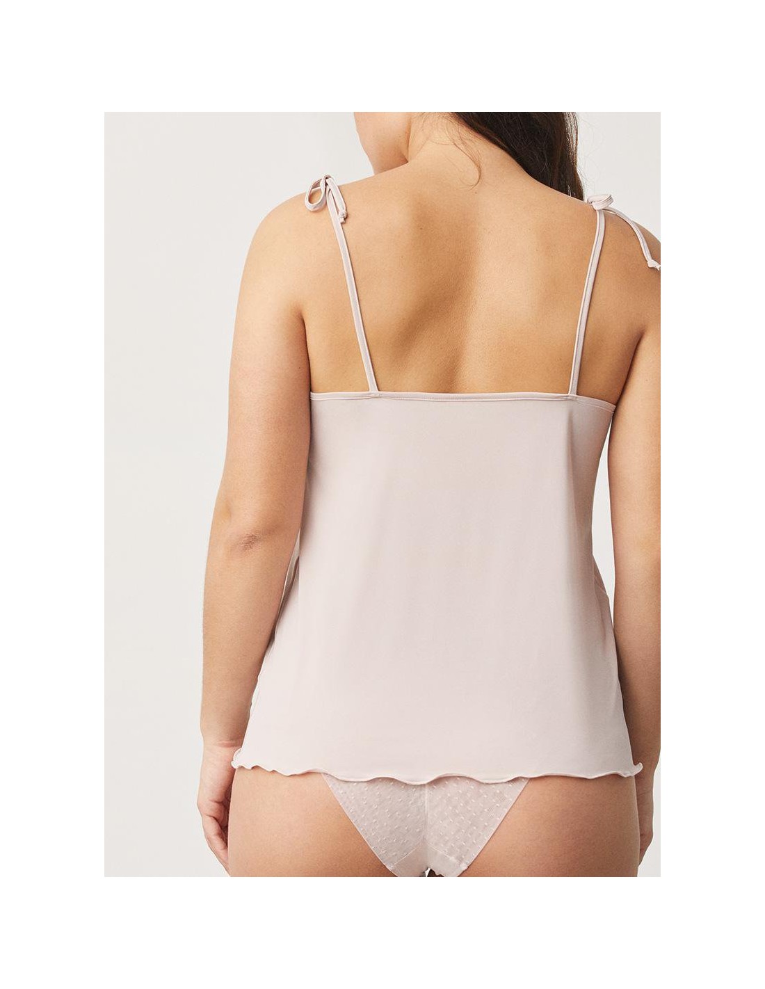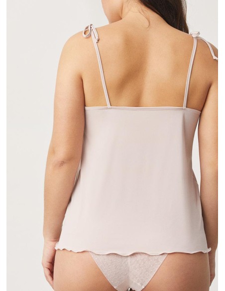 Camiseta de tirantes tejida en suave microfibra. Sensualidad y feminidad en una prenda decorada con tul plumetti en la zona del escote. Los tirantes finos se anudan en los hombros para un mejor ajuste de la altura en función de tu silueta. Los acabados de estilo ruffled le dan movimiento a la prenda. Combínala con la braguita a juego para crear tu set perfecto.