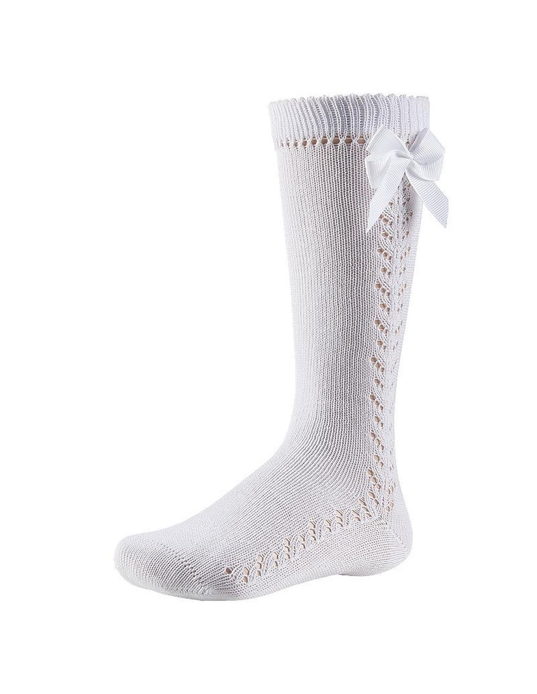 Calcetines para niña tejidos en suave algodón peinado y delicadamente remallados a mano. Comodidad y confort en los puños antipresión. Detalles calados y decorados con lazo al tono.