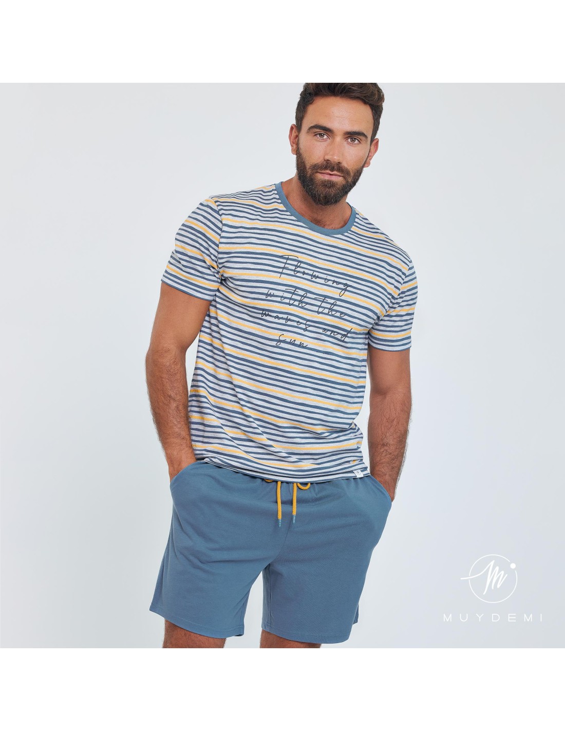 Las olas, el sol y la libertad. Te haré sentir único por mi diseño tan original. Mi camiseta tiene rayas en tonos azules y amarillos. Tengo la frase “Flowing with the waves and sun”. Mi pantalón es azul y en contraste los bolsillos en amarillo y el cordón.
