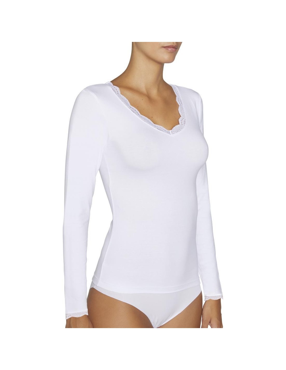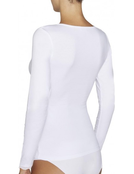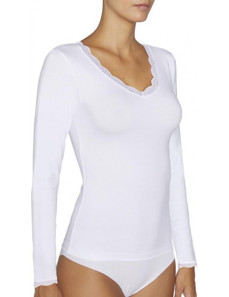 Camiseta de manga larga y escote redondo en tejido Cotton Nature. Las fibras naturales de este material aportan un extra de suavidad a la prenda. Sus acabados con costuras planas invisibles evitan las marcas y favorecen una mayor adaptabilidad y un ajuste ergonómico perfecto. Modelo básico de gran confort pensado para el día a día. Decoradas con blonda. Confeccionadas con material antialergénico.