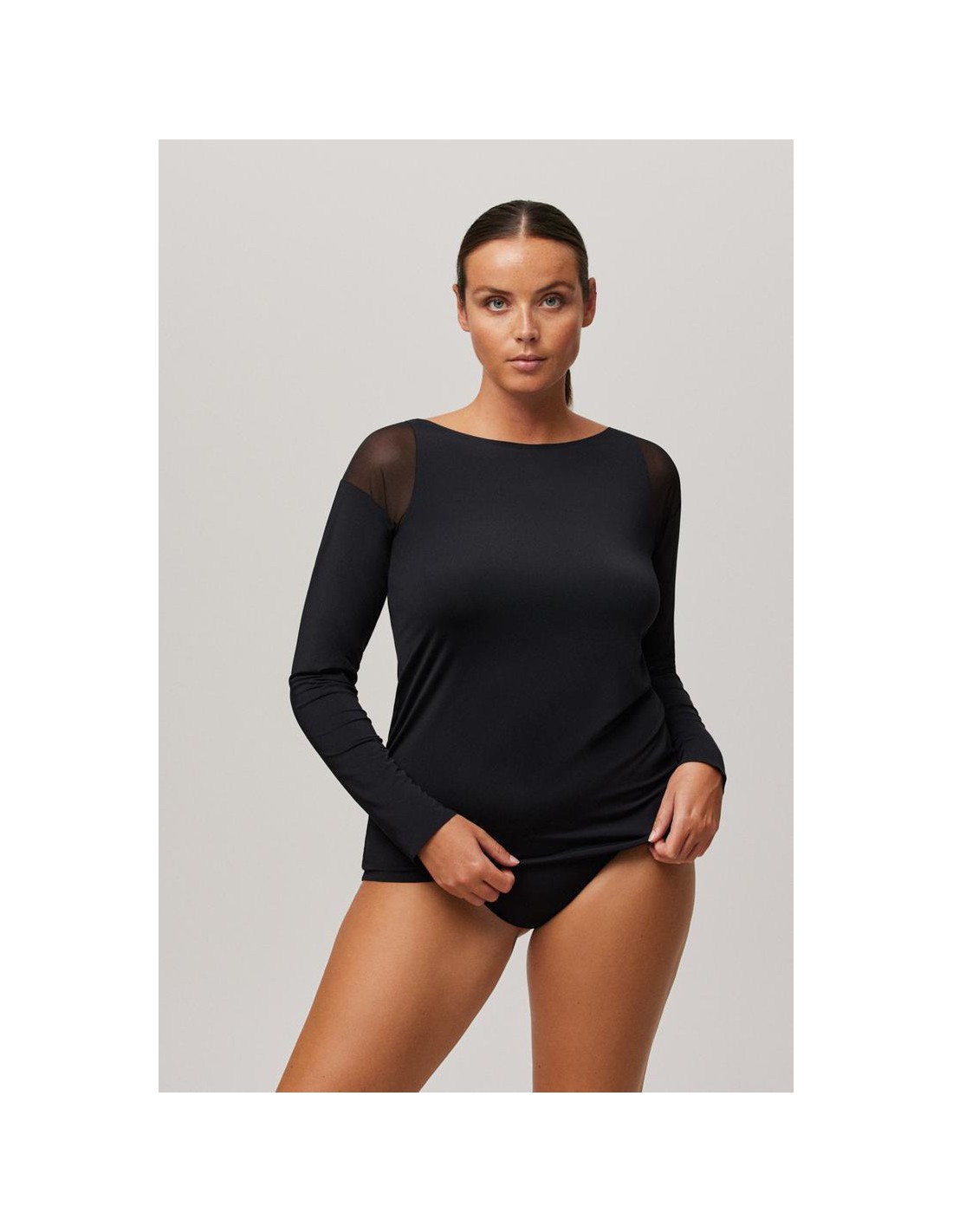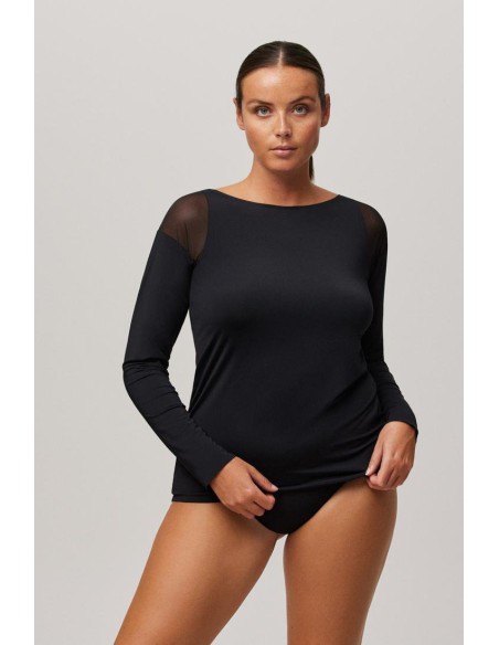 Camiseta de manga larga de escote redondo con costuras estratégicas y ligeros detalles de tul en la zona de los hombros que le aportan un toque de sofisticación. Una prenda versátil, ya que puede ser utilizada como prenda interior o exterior, creando looks muy favorecedores. Combina la camiseta con una braguita de la colección y crea tu estilo perfecto.