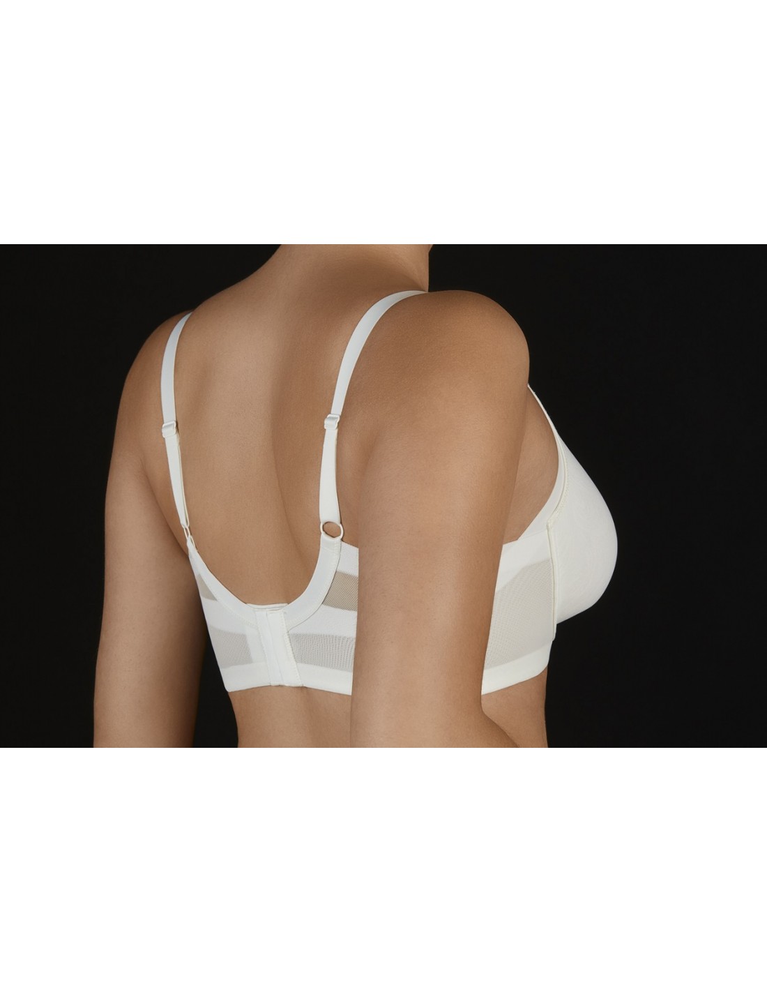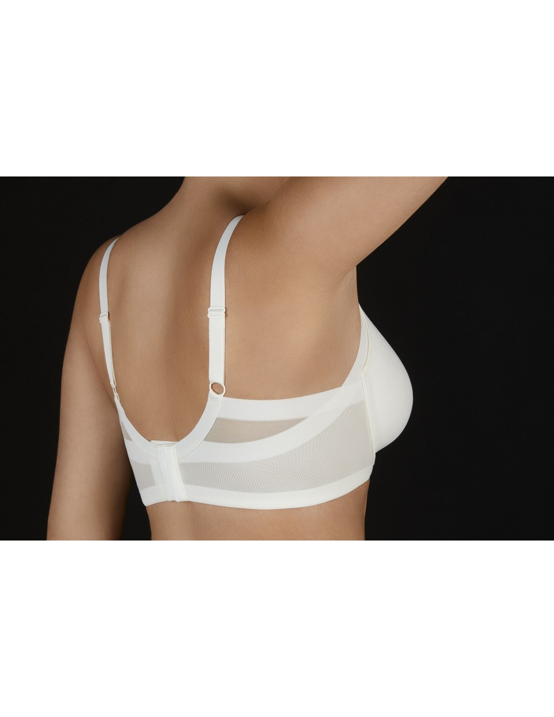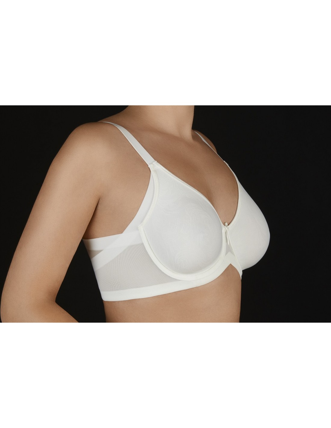 Sujetador con aros sin relleno y cruzado de tules de control con corte laser, especialmente diseñado para cubrir y minimizar las irregularidades del costado y las axilas, proporcionando una cobertura perfecta, alisando y estilizando tu figura.
