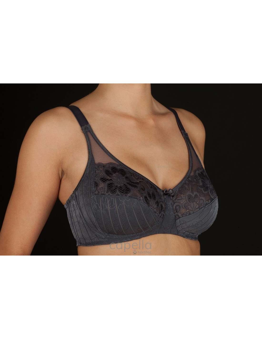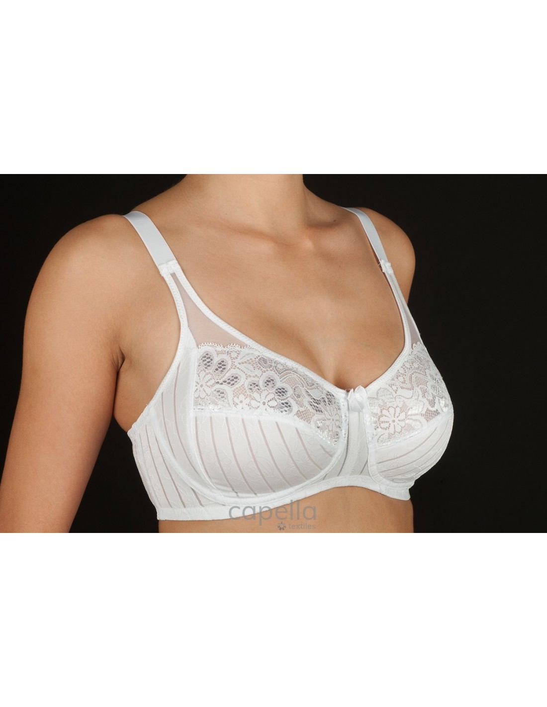 SUJETADOR SIN ARO QUE COMBINA UN ELEGANTE TEJIDO CON FRANJAS Y COPA EN TUL CON ENCAJE. La copa C la traemos por encargo.