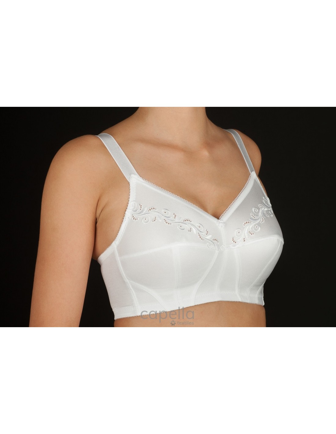 CLÁSICO DE MEDIO CUERPO SIN AROS, FABRICADO EN TEJIDO SIMPLEX BORDADO.
