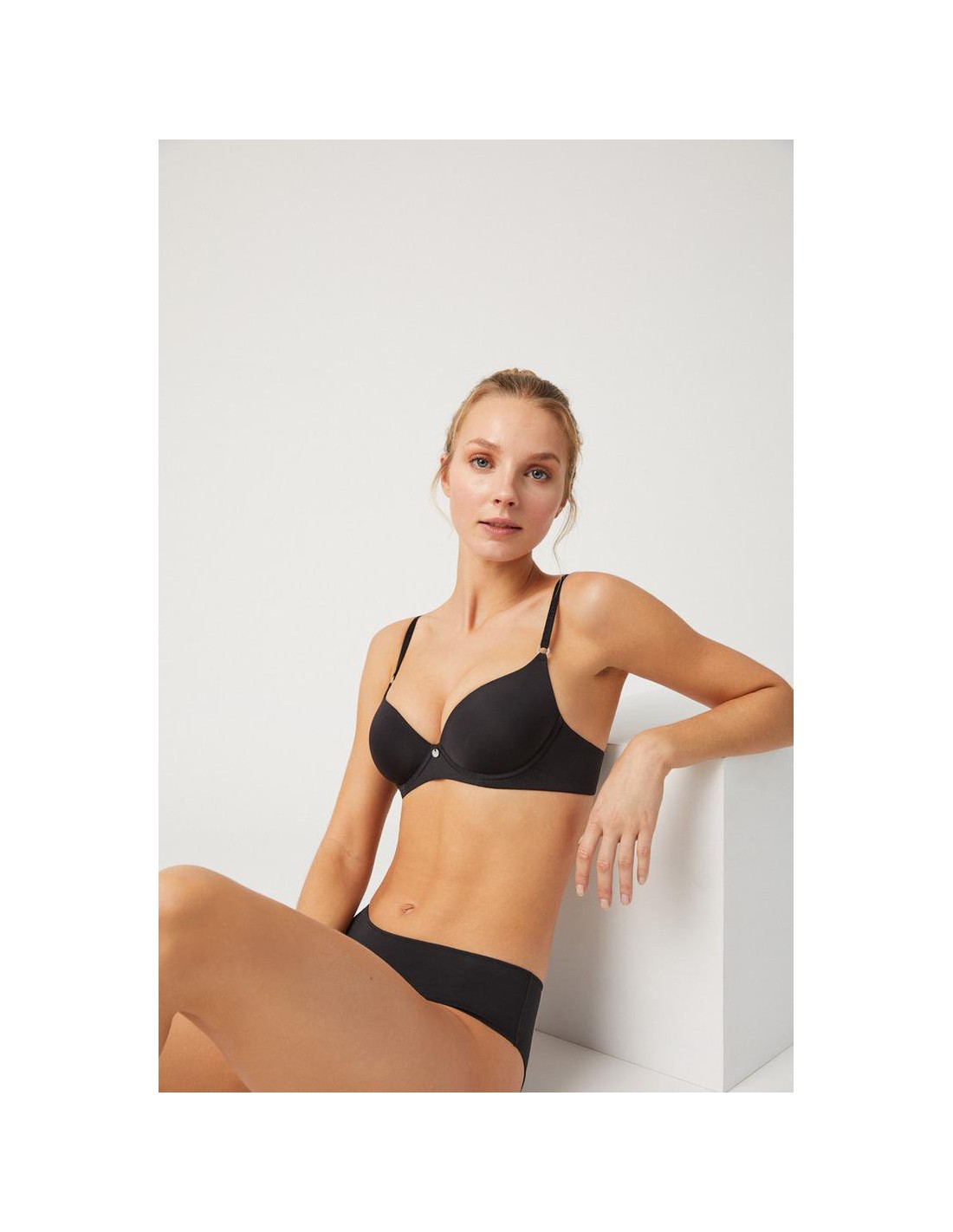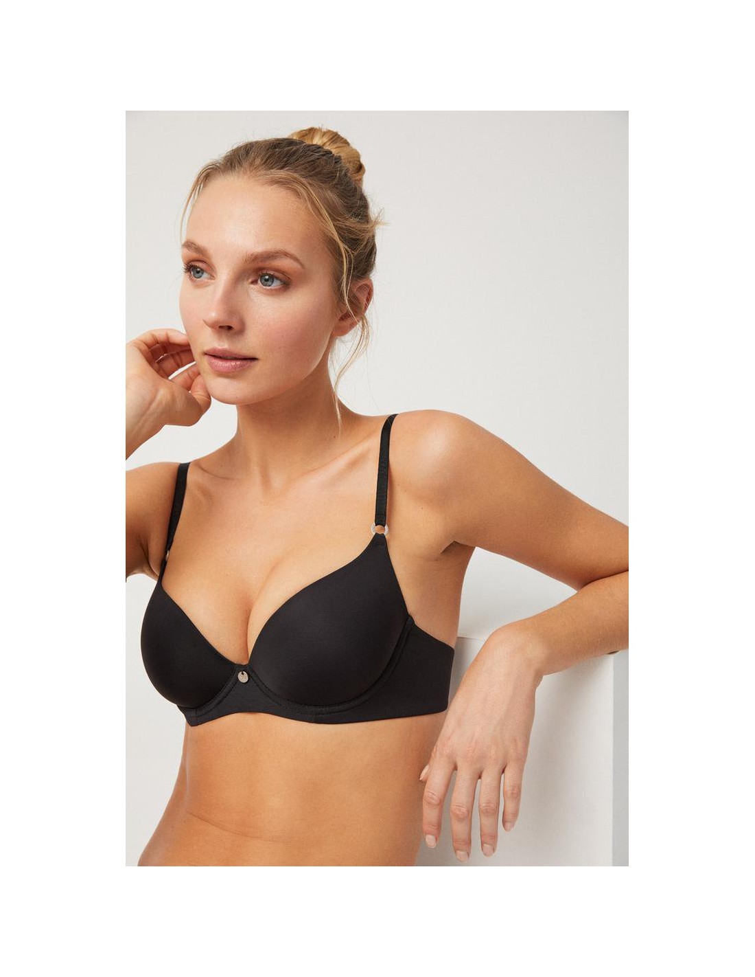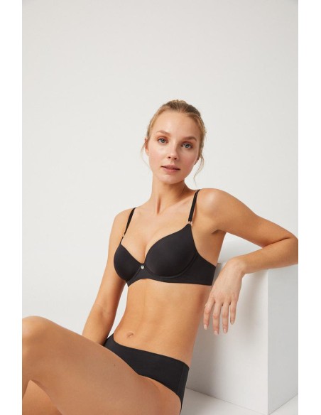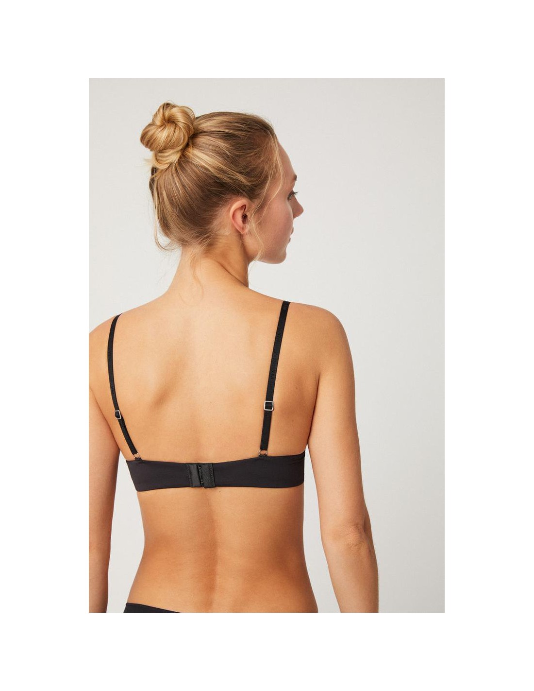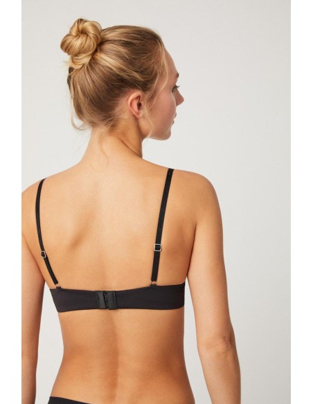 Sujetador con interior del cierre forrado evitando rozaduras y espalda con costuras invisibles. Los reguladores metálicos permiten ajustar el tirante a diferentes alturas.