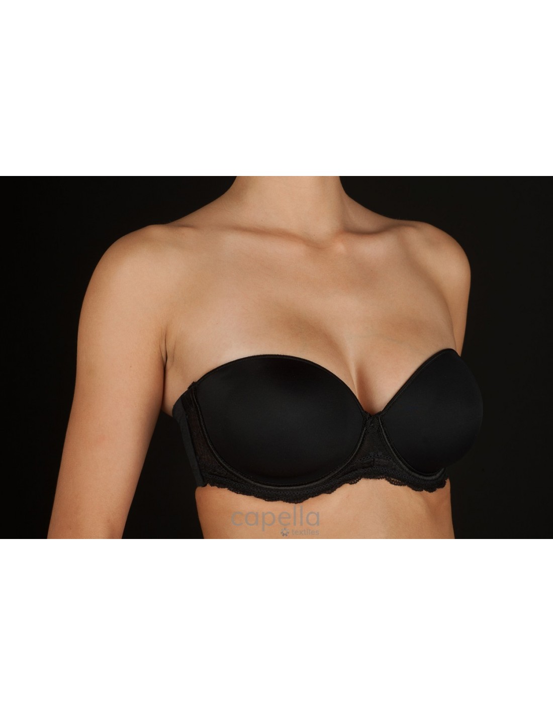 SUJETADOR SIN TIRANTES, DE MICROFIBRA, CON AROS, COPA DE RELLENO E INSERCION DE ENCAJE EN LATERAL DE COPA. INCLUYE JUEGO DE TIRANTES TEXTILES.