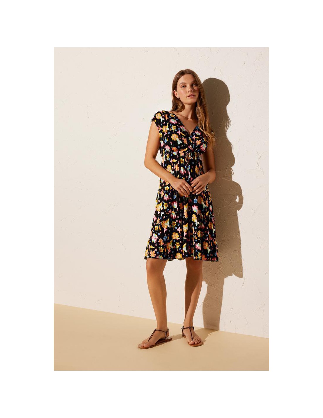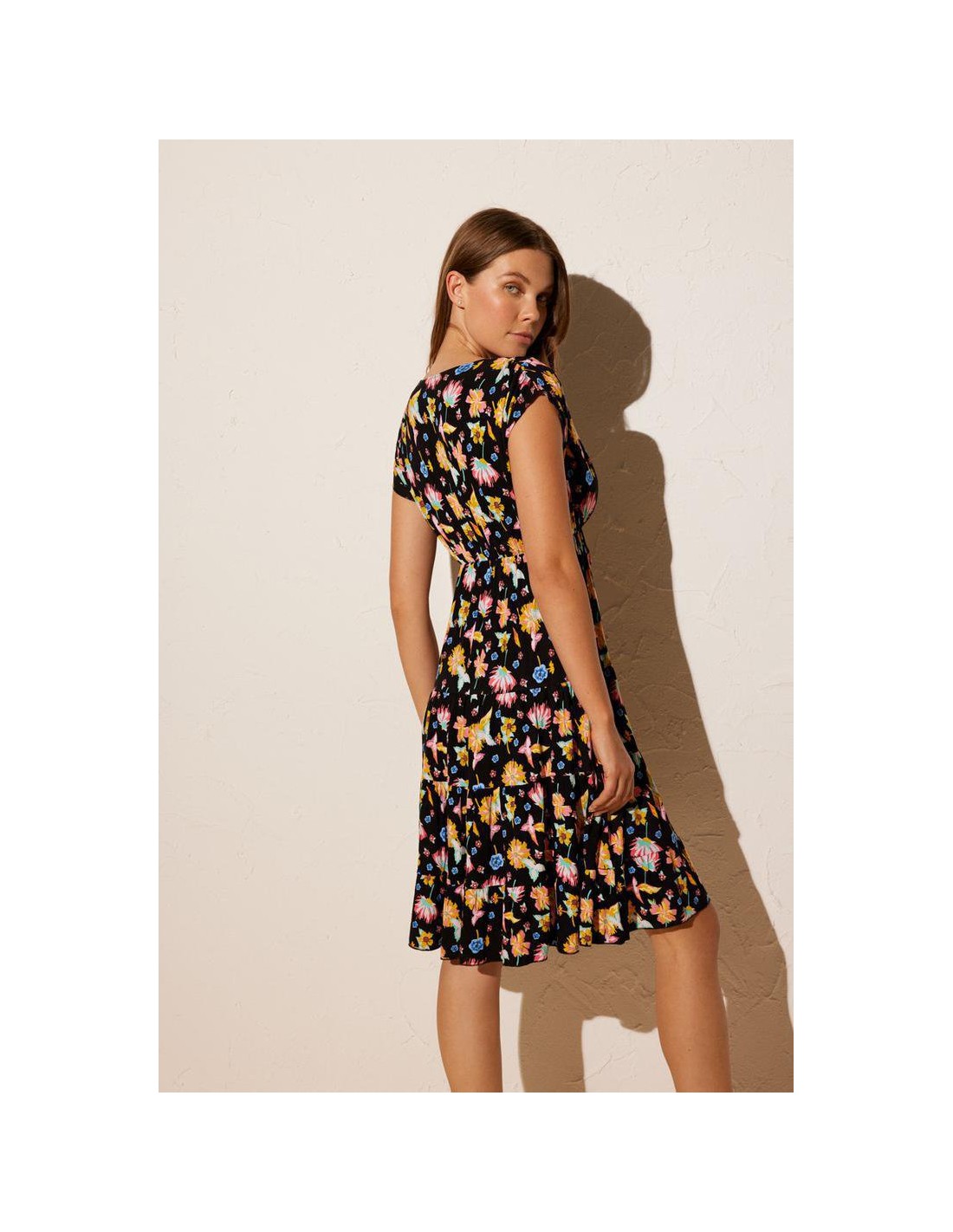 Pequeñas flores dan color a este vestido midi de estilo fluido y tejido ligero. Diseño con manga corta y escote en V. Crea tu total look con bikini o bañador a juego de la colección.